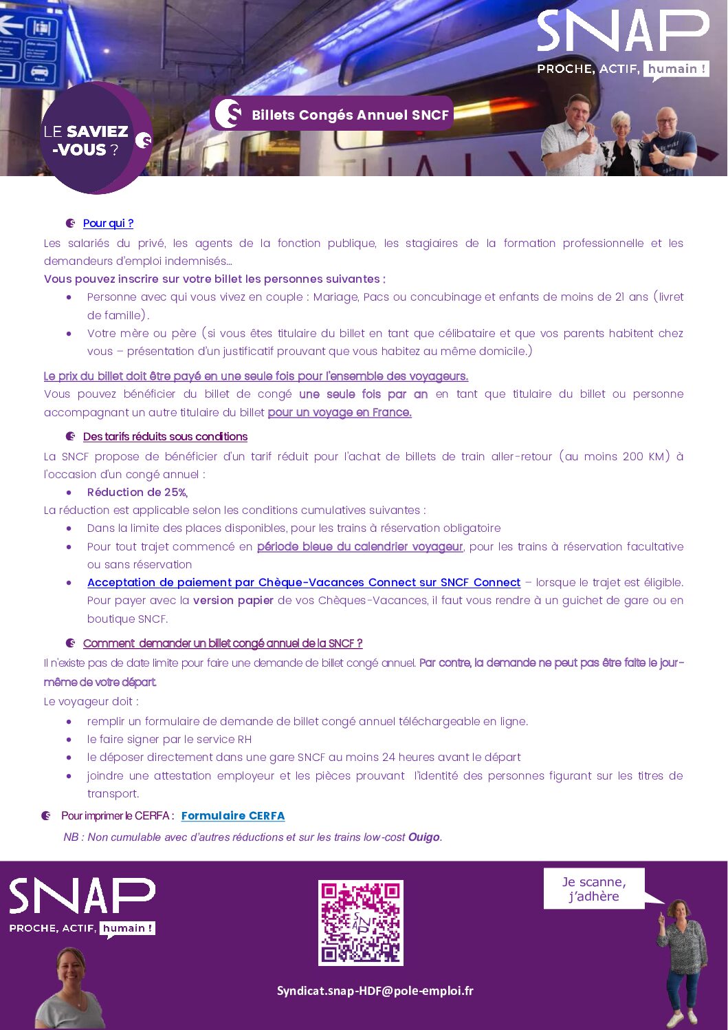 Le Billet Congé Annuel SNCF Billet Congé Annuel SNCF Vous trouverez ci-contre une information sur le Billet Congé Annuel SNCF. Pour plus d’infos, n’hésitez pas à nous contacter. L’équipe régionale SNAP Pôle Emploi Hauts-de-France Cliquez sur notre publication pour plus de détails Et aussi Mar 31 2026 Les Essentiels du CSE de Mars 2026 Mar 04 2026 Les essentiels du CSE février 2026 Fév 21 2026 Ce qu’il faut savoir sur le référendum GEPP Fév 18 2026 Calendrier des formations SNAP second semestre 2026 Fév 18 2026 Assemblée Générale 2026 Fév 04 2026 Les essentiels du CSE janvier 2026 Fév 03 2026 l’info utile en temps utile : EPA 2026 Déc 16 2025 Le calendrier des formations SNAP pour le premier semestre 2026 Déc 06 2025 L’intéressement et CCV 2025 Oct 14 2025 CSE du 3 octobre 2025
