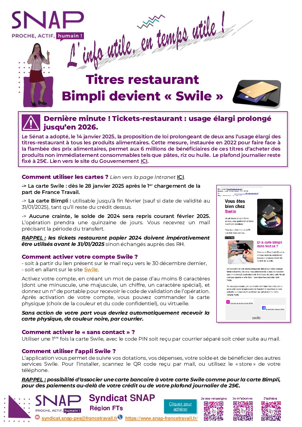 Swile : nouveau prestataire pour les tickets restaurant Bimpli devient Swile Toutes les informations utiles résumées sur la modification de notre prestataire pour les tickets restaurant à Lire aussi Avr 13 2026 France Travail Services Déclaration des cotisations syndicales aux impôts 2026 Avr 10 2026 France Travail Services Le baromètre interne Avr 08 2026 France Travail Services Le calendrier des formations SNAP FTs à partir de mai 2026 Mar 30 2026 France Travail Services Le SNAP FTs vous informe sur la médaille du travail promotion du 14/07/2026 Mar 27 2026 France Travail Services Les essentiels du CSE FTs du 26 mars 2026 Mar 16 2026 France Travail Services Le référendum sur l’Accord GEPP Mar 11 2026 France Travail Services Réunion HMI SNAP sur référendum Accord GEPP Proches, actifs et humains, nous nous engageons à agir pour que vous puissiez travailler dans des conditions confortables, saines et sûres, avec des salaires équitables. Cliquez ici